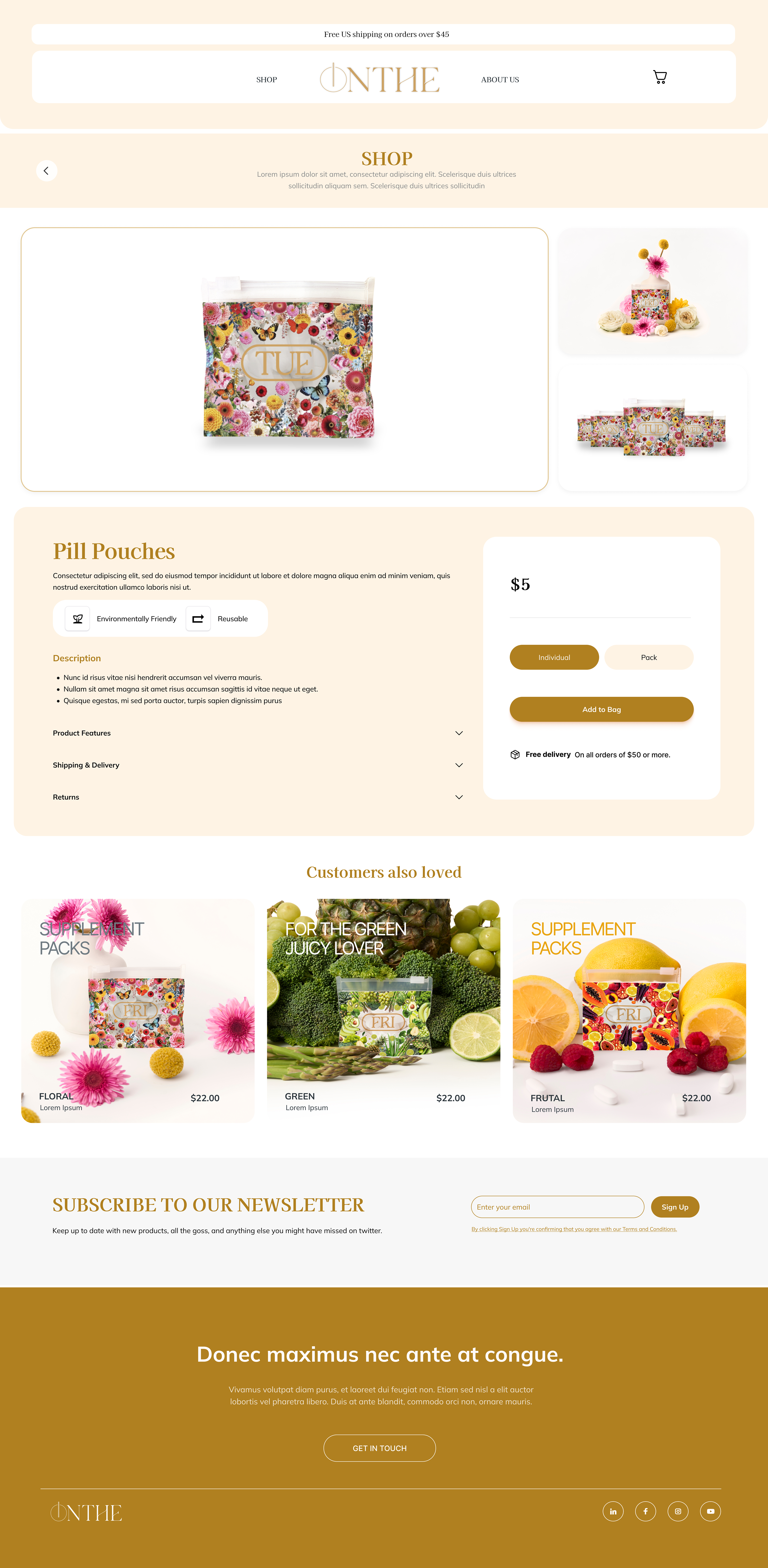 Product Page focuses on storytelling around the pouches, emphasizing features and usability with an elegant structure.