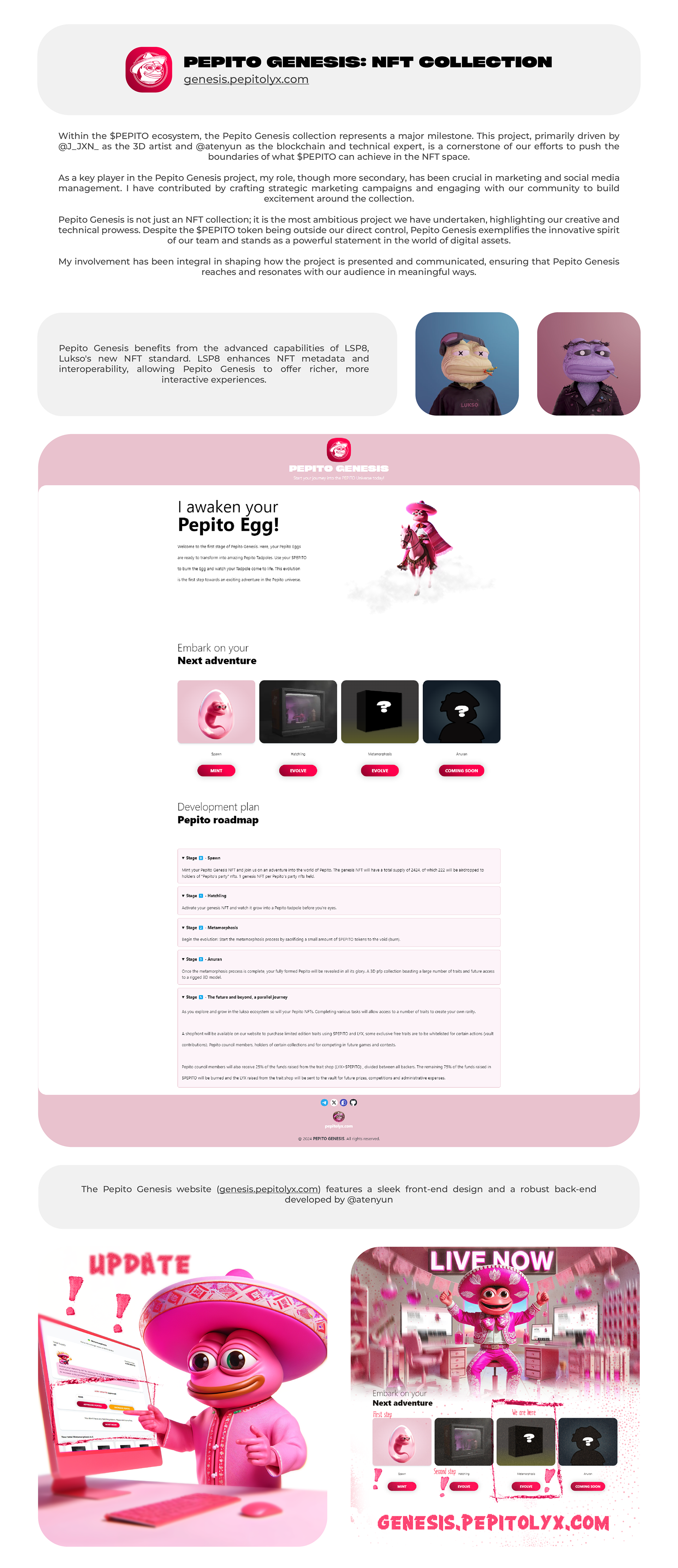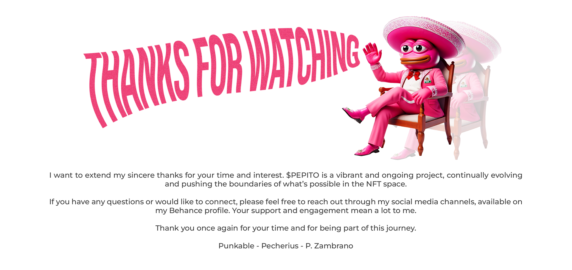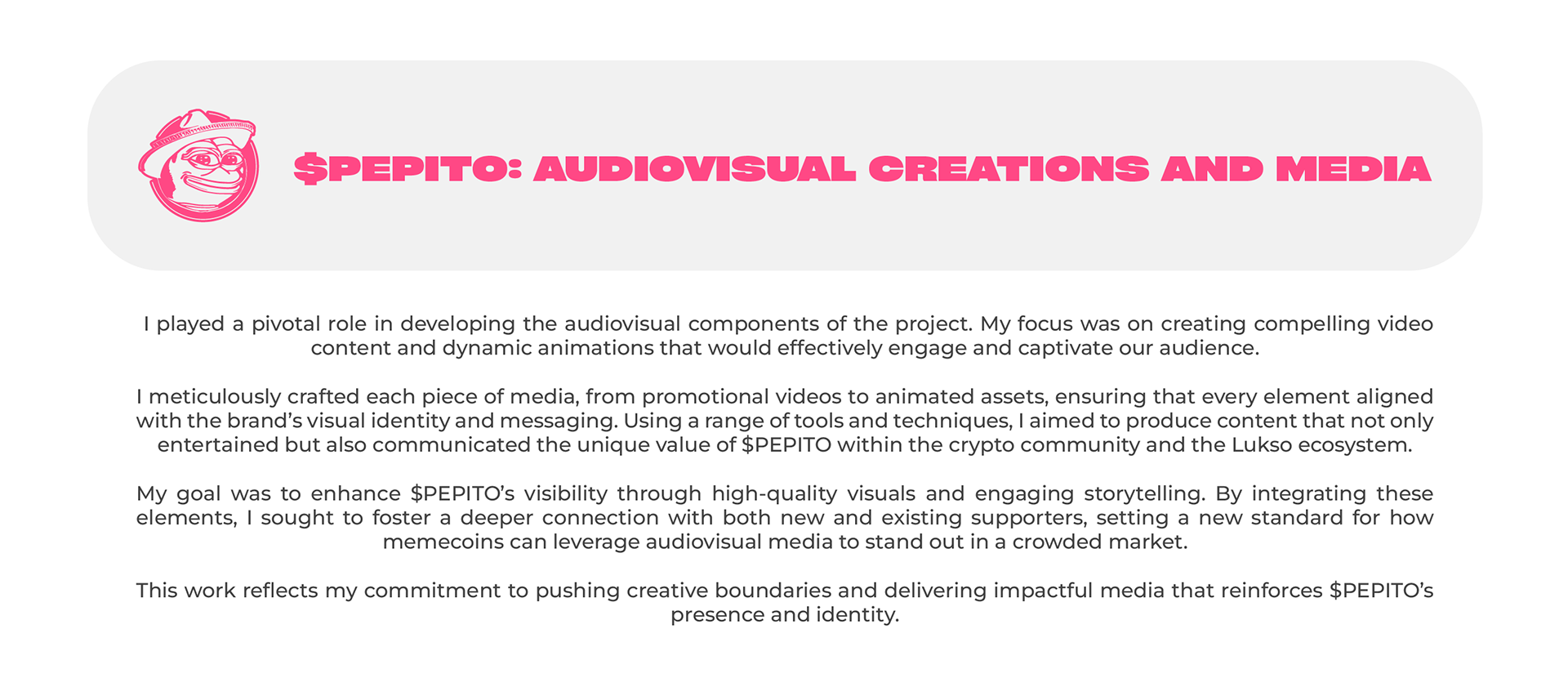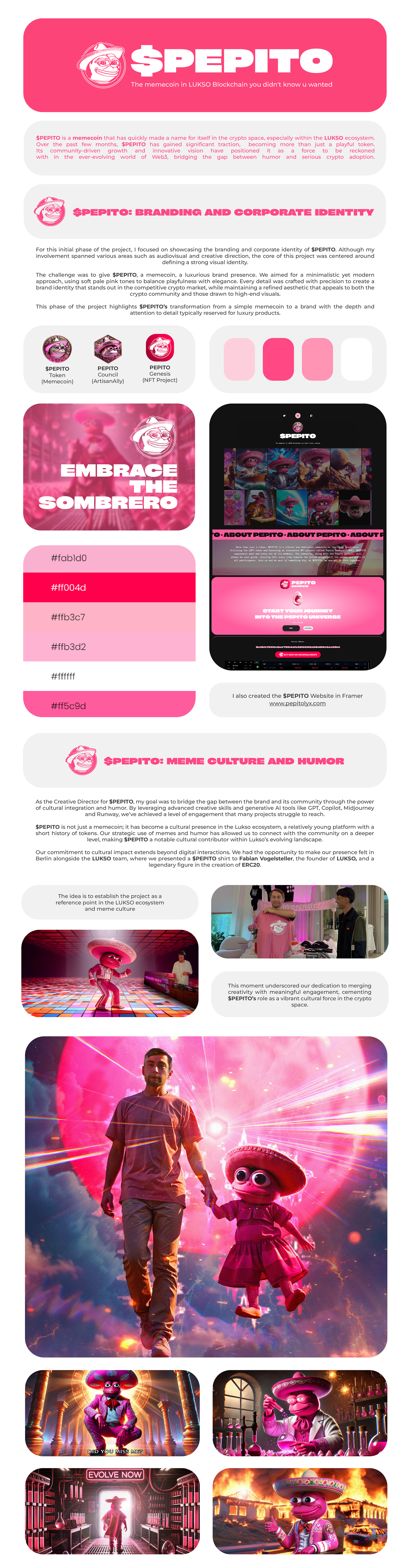 This project showcases my creative work on $PEPITO, from branding and design to audiovisual content. As the creative lead, I helped shape $PEPITO's identity in the crypto and Lukso ecosystems, blending luxury with a fun, minimalistic style.